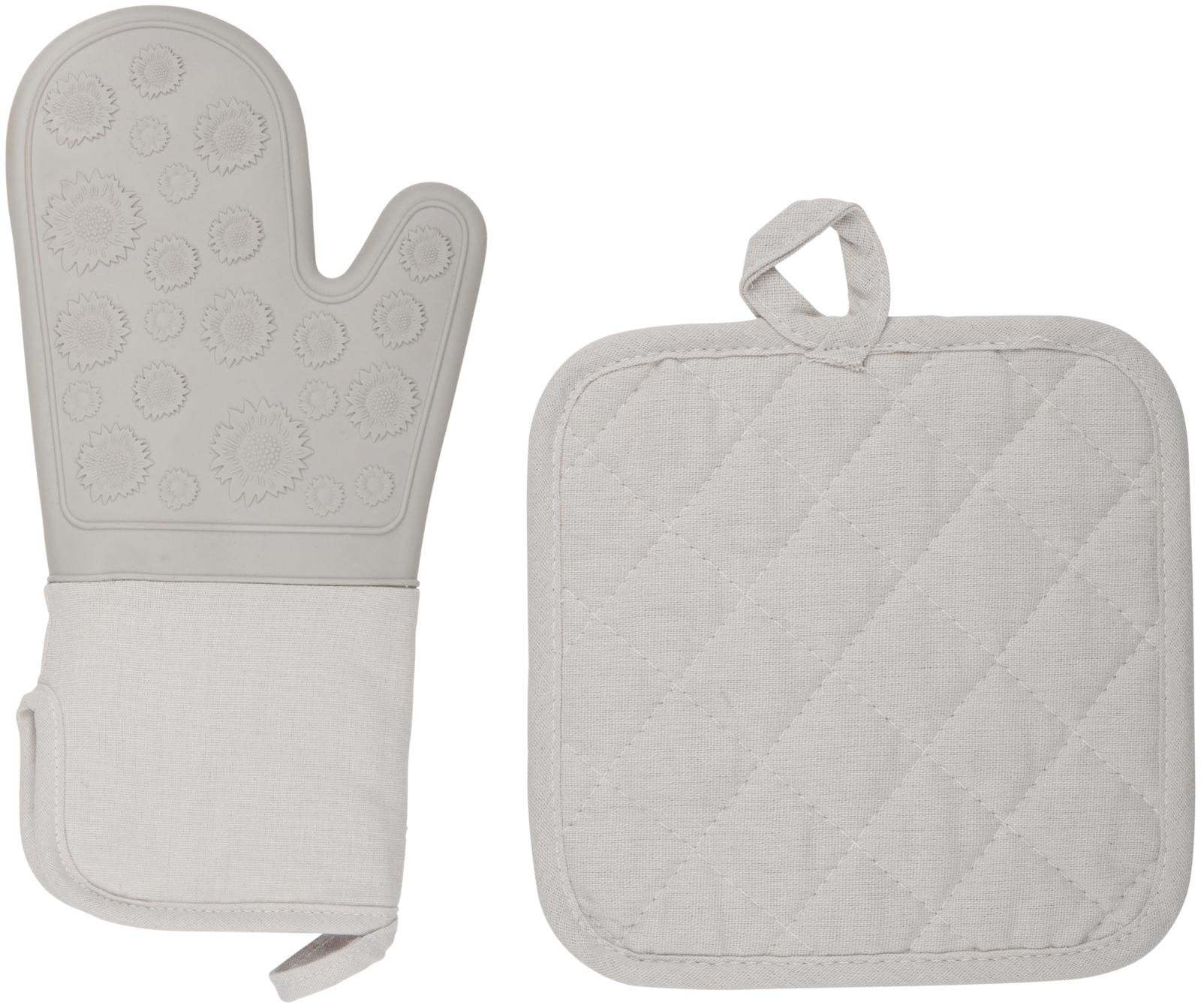Den grå grytevotten har et strukturert silikonbelegg som gir ekstra godt grep og varmebeskyttelse, mens grytekluten er vattert for komfort og fleksibilitet. Begge deler har praktiske opphengsløkker og passer perfekt til daglig bruk på kjøkkenet. Det stilrene grå designet passer inn i ethvert kjøkken og kombinerer funksjon med moderne estetikk – et trygt og elegant valg for matlaging med stil.