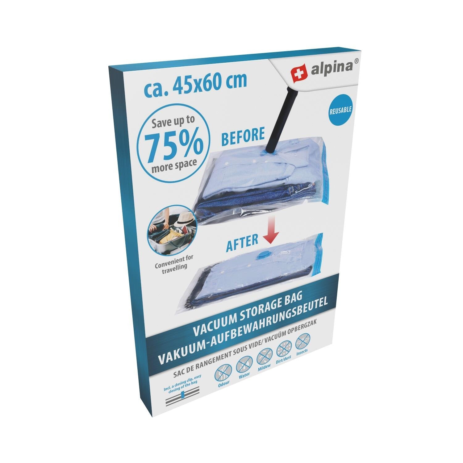 Spar plass og hold klærne beskyttet med alpina vakuumoppbevaringspose. Denne gjenbrukbare posen komprimerer innholdet og reduserer volumet med opptil 75 %, noe som gjør den perfekt til både hjemmebruk og reise.